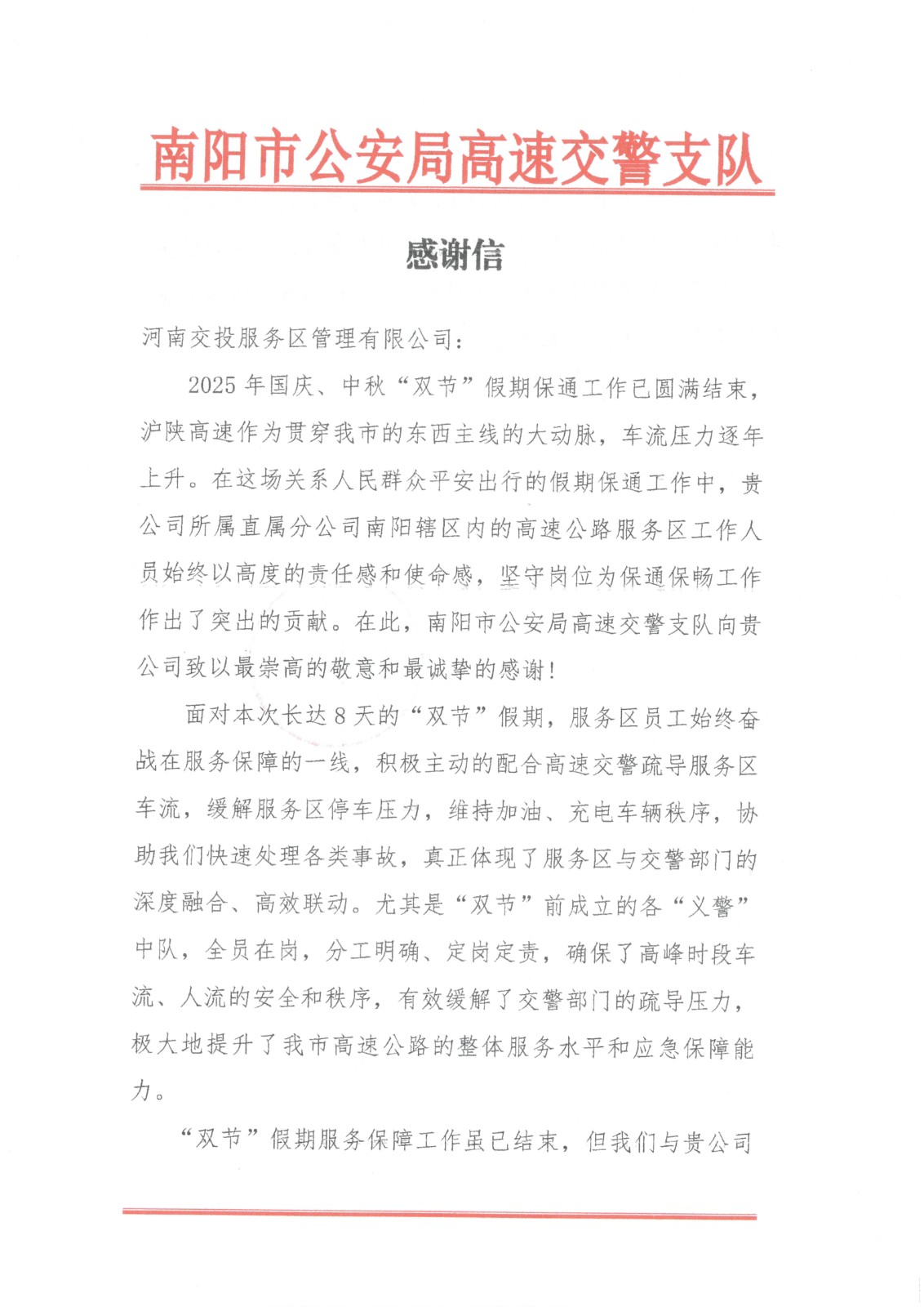 《一封感謝信 濃濃服務(wù)…》 10月10日,南陽市公安局高速交警支隊向公司所屬直屬分公司寄來感謝信,表達對南陽轄區(qū)內(nèi)…